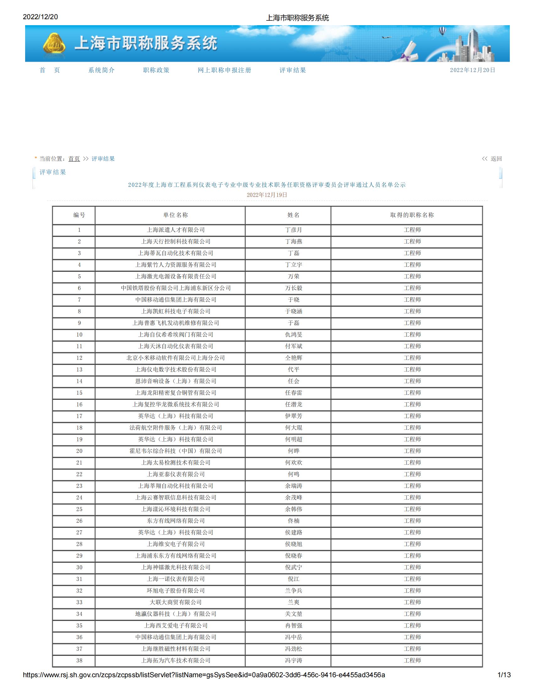 2022年度上海市工程系列儀表電子專業中級專業技術職務任職資格評審委員會評審通過人員名單公示